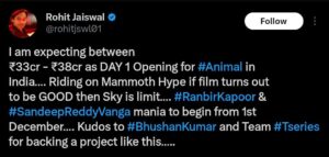 रणबीर कपूर, बॉबी देओल और अनिल कपूर की फिल्म ‘एनिमल’ रिलीज होने से पहले ही धमाल मचा रही है। फिल्म के गानों को लोग काफी पसंद कर रहे है। इन सब के बीच अब ‘एनिमल’ की कमाई को लेकर चर्चा शुरू हो गई है। मीडिया रिपोर्ट्स के मुताबिक रणबीर कपूर और रश्मिका मंदाना की फिल्म ‘एनिमल’ पहले दिन बंपर कमाई करने वाली है। इसी से जुड़ा एक ट्वीट भी खूब वायरल हो रहा है। इस ट्वीट में बताया गया है रणबीर कपूर की फिल्म पहले दिन 33-38 करोड़ रुपये कमा सकती है। लेकिन आपको बता दें कि कमाई के ये आंकड़े अनुमानित है। अभी तक फिल्म की कमाई को लेकर कुछ भी अधिकारित तौर पर नहीं आया है।